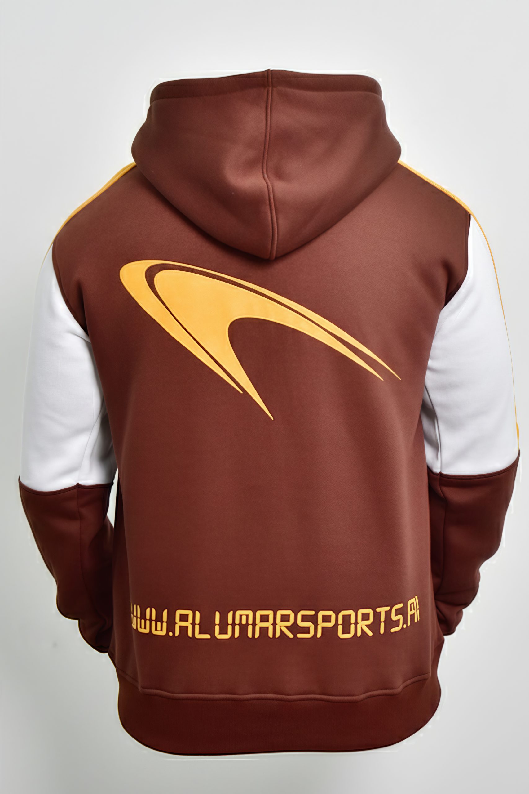 y style. This piece masterfully combines deep maroon with crisp white paneling, giving it a modern, athletic look. Crafted with a premium blend of 65% Cotton and 35% Polyester, it offers the perfect balance of softness, breathability, and long-lasting durability for season after season. The stylish panel work on the shoulders and chest adds a structured, elevated finish to the design. The back is the focal point, featuring a dynamic, sweeping graphic and the ALUMARSPORTS website, both executed with premium puff printing. This technique creates a raised, dimensional texture that makes the artwork instantly pop and showcases a commitment to high-quality detailing. Perfect for layering up after a workout or as your go-to weekend wear, this hoodie is a statement in comfort and modern design.